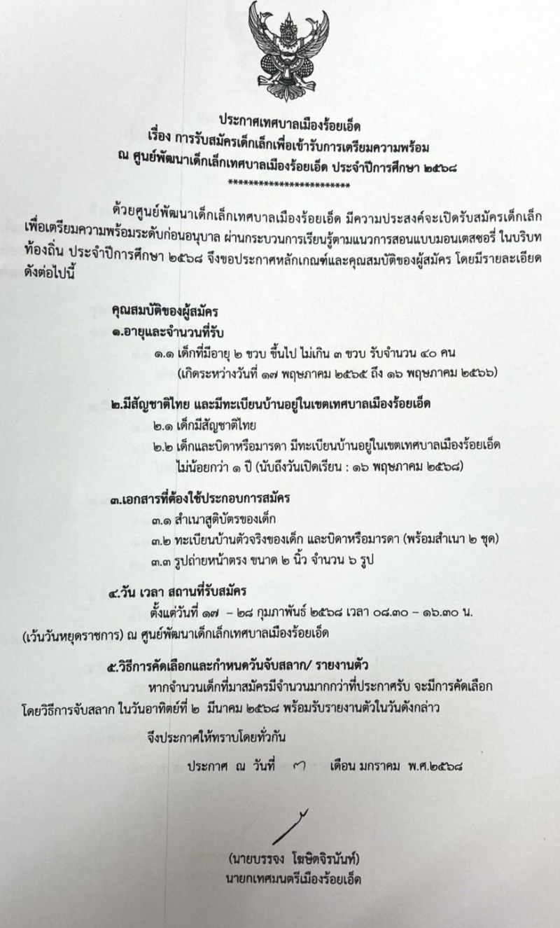 ประกาศเทศบาลเมืองร้อยเอ็ดเรื่องการรับสมัครเด็กเล็กเพื่อเข้ารับการเตรียมความพร้อมณศูนย์พัฒนาเด็กเล็กเทศบาลเมืองร้อยเอ็ดเทศบาลเมืองร้อยเอ็ดประจำปีการศึกษา2568